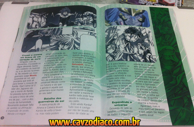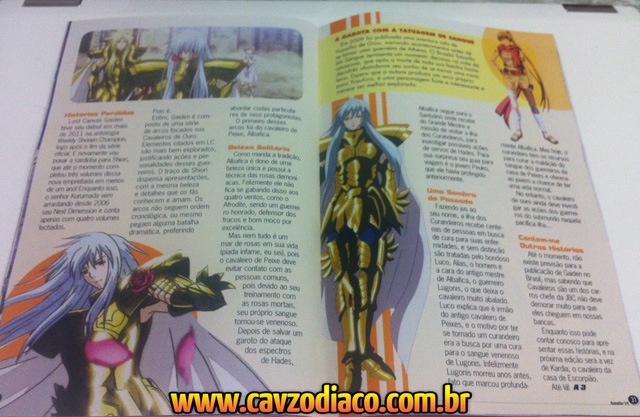 As edições 114 e 115 da revista brasileira Anime Do (uma das mais antigas relacionadas a anime e mangá) trouxeram matérias interessantes sobre as histórias solo (gaidens) dos Cavaleiros de Ouro do Lost Canvas. Veja as imagens: